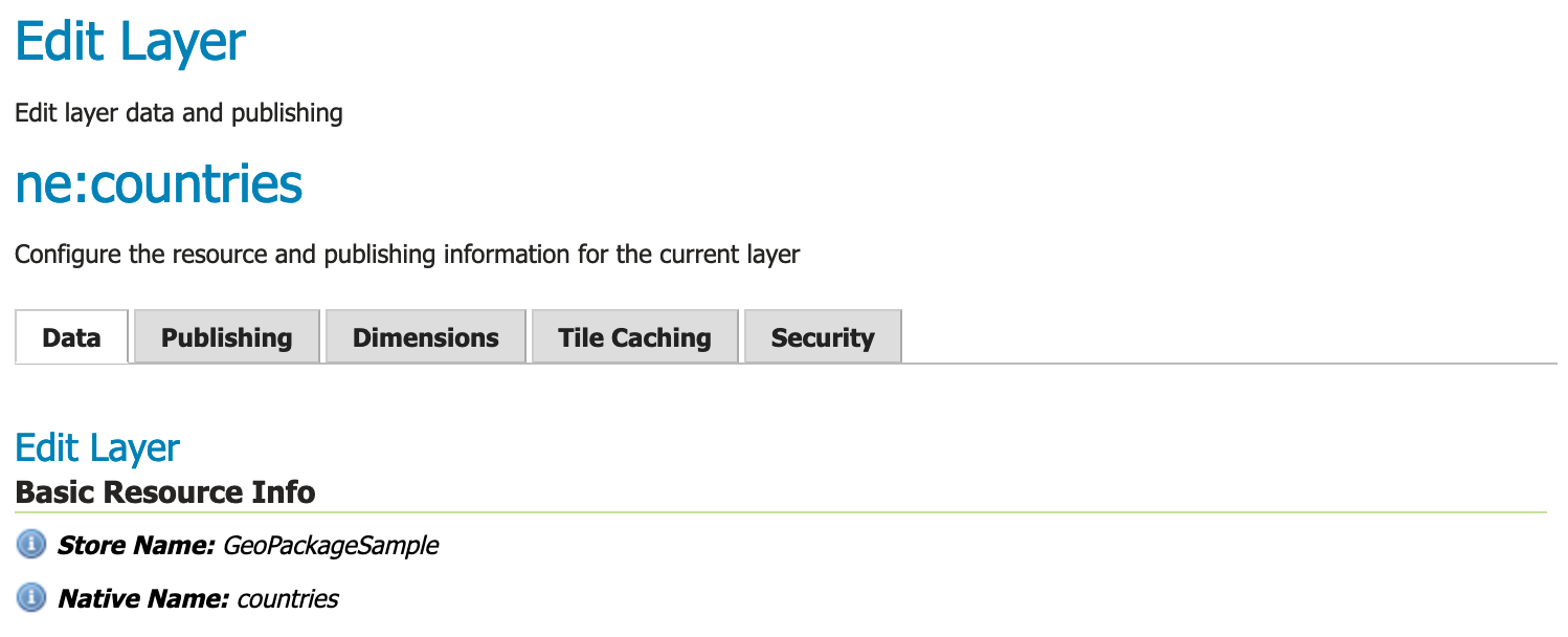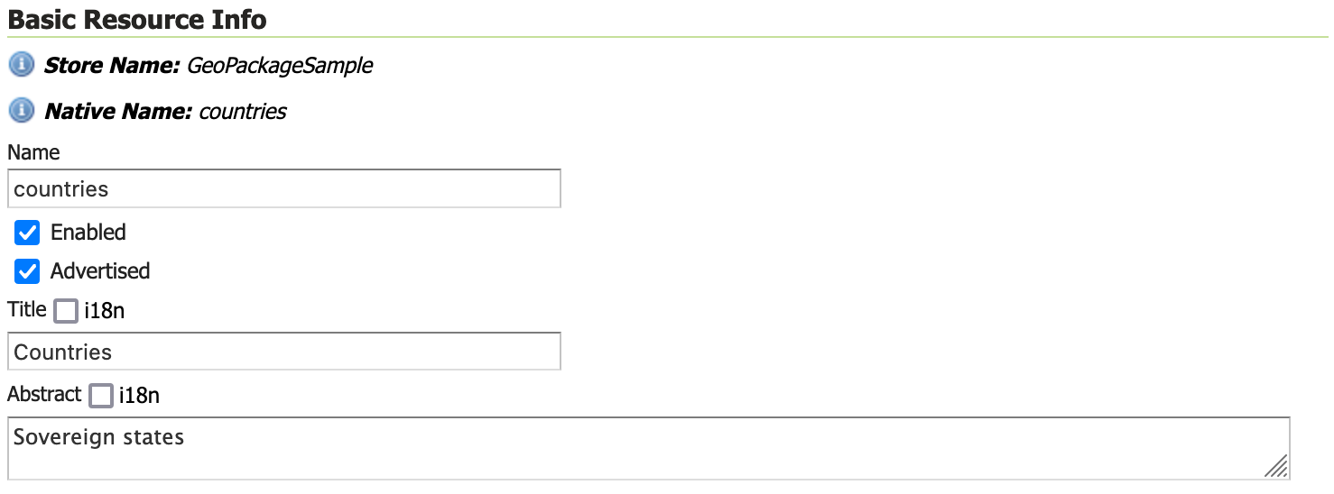 Field Value Name countriesTitle CountriesAbstract Sovereign statesThe naming of a layer is important, and while GeoServer does not offer restrictions many of the individual protocols will only work with very simple names.