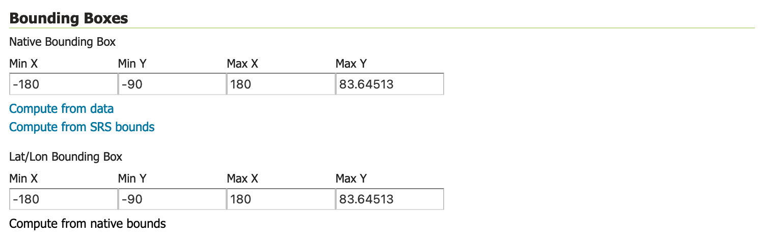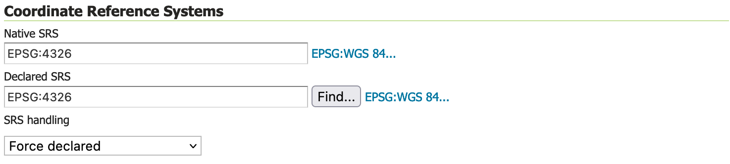 Field Value Native SRS EPSG:4326Declaired SRS EPSG:4326SRS Handling Force declared