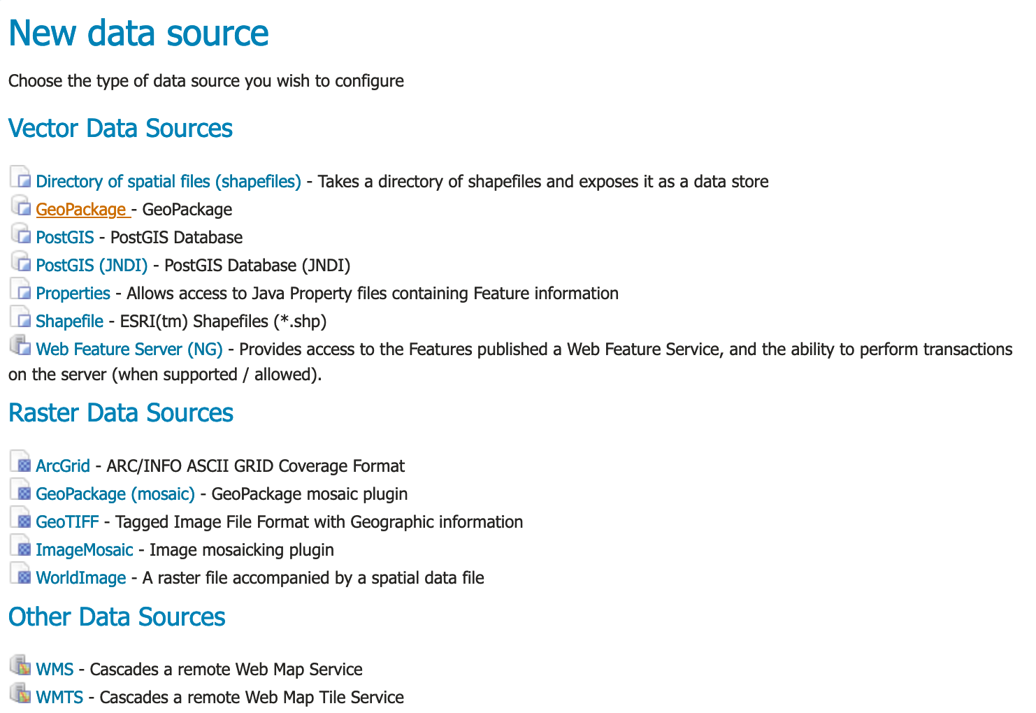 In order to add the geopackage, you need to create a new store. Click the Add new Store button. You will be redirected to a list of the data sources supported by GeoServer. Note that the data sources are extensible, so your list may look slightly different.