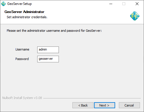 Enter the username and password for administration of GeoServer. GeoServer's Web administration interface requires authentication for management, and what is entered here will become those administrator credentials. The defaults are admin / geoserver. It is recommended to change these from the defaults. When finished, click Next.