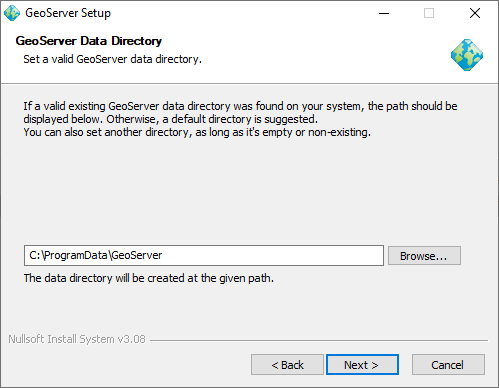 Enter the path to your GeoServer data directory or select the default. If this is your first time using GeoServer, select the Default data directory. When finished, click Next.