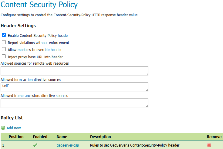 The Content Security Policy page controls how GeoServer prepares the Content-Security-Policy (CSP) HTTP response headers, used to mitigate cross-site scripting and clickjacking attacks.
