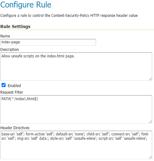 - The Header Directives text field contains the CSP directives to add to the header value when a request matches this rule's filter. (see Header Directives below)