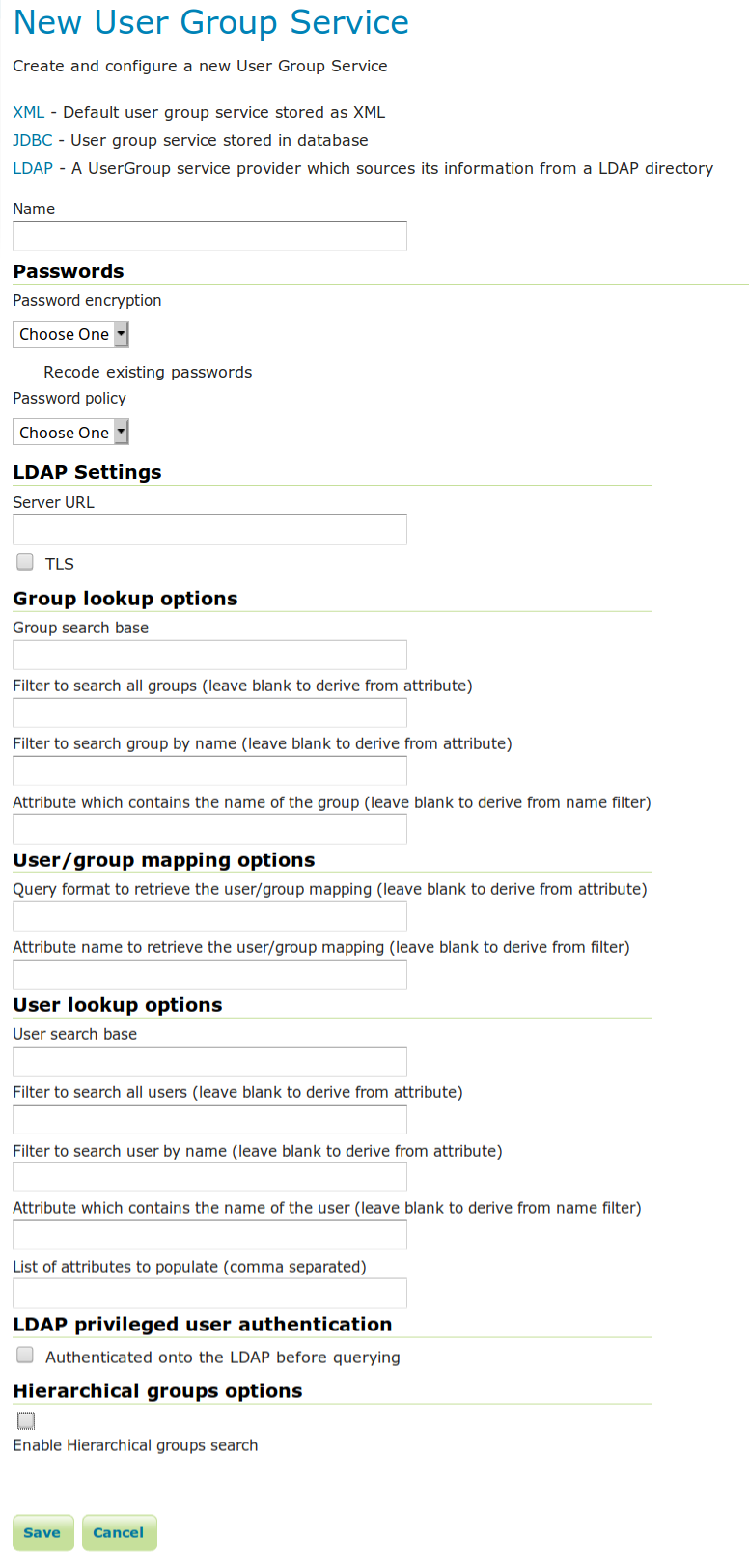 To add a new LDAP user/group service, click the Add new link, and then the LDAP option at the top of the following form. The following figure shows the configuration options for a LDAP user/group service.