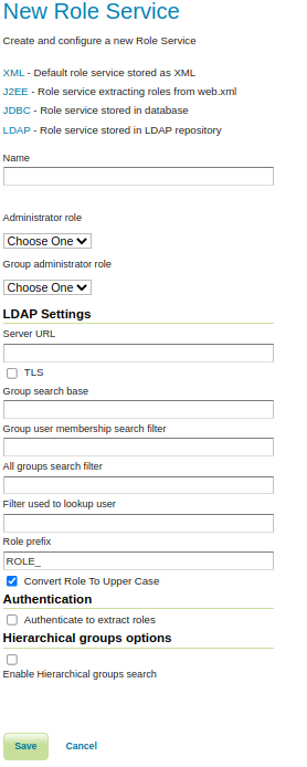 To add a new LDAP role service, click the Add new link, and then the LDAP option at the top of the following form. The following figure shows the configuration options for a LDAP role service.