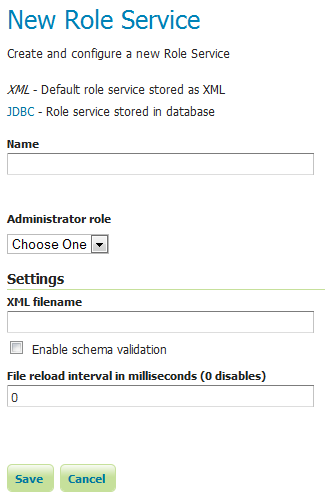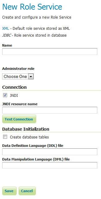 To add a new XML role service, click the Add new link, and then the JDBC option at the top of the following form. The following figure shows the configuration options for a JDBC role service.