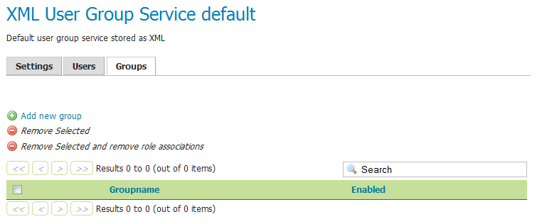 The Groups tab provides configuration options for groups in this user/group service. There are options to add and remove a group, with an additional option to remove a group and the roles associated with that group.