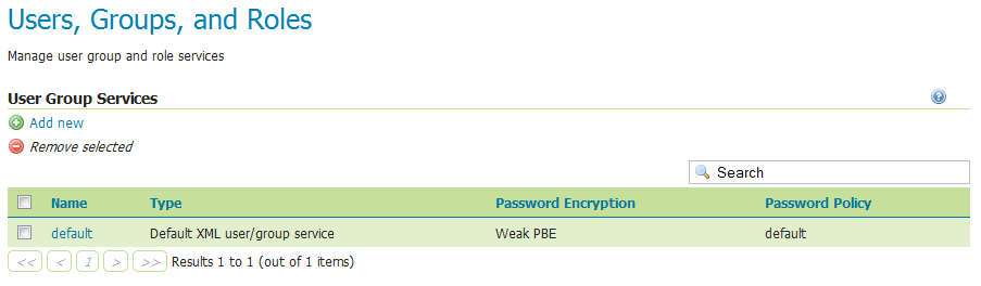 In this menu, user/group services can be added, removed, or edited. By default, there is one user/group service in GeoServer, which is XML-based. It is encrypted with Weak PBE and uses the default password policy. It is also possible to have a user/group service based on JDBC, with or without JNDI.