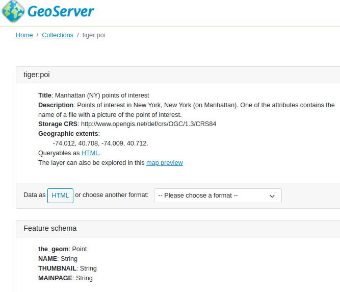 Data can be browsed as web pages, or downloaded in a range of formats such as GeoJSON and GML documents.