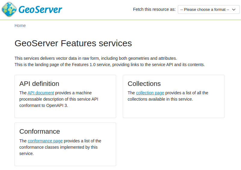 The OGC API Features Service is accessed via the Features version 1.0.1 link on the home page.