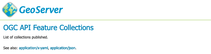 GEOSERVER_DATA_DIR/workspace/templates/ogc/collections.ftl, and rewrite as:<#include "common-header.ftl"> <h2>OGC API Feature Collections</h2> <p>List of collections published.</p> <p>See also: <#list model.getLinksExcept(null, "text/html") as link> <a href="${link.href}">${link.type}</a><#if link_has_next>, </#if></#list>.</p> <#list model.collections as collection> <h2><a href="${serviceLink("collections/${collection.id}")}">${collection.id}</a></h2> <#include "collection_include.ftl"> </#list> <#include "common-footer.ftl"> -