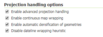 Advanced projection handling and continuous map wrapping functionalities are rather useful, and enabled by default, but the tendency to generate multiple or-ed bounding boxes (to query both sides of the dateline) can cause extreme slowness in certain databases (e.g. Oracle), and some users might simply not like the wrapping output, thus, it's possible to disable both functions in the WMS UI: