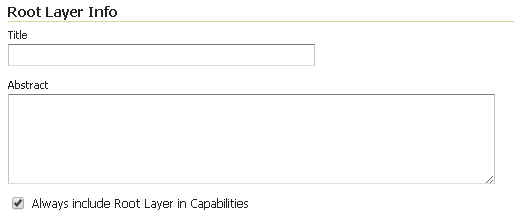 In this section is possible to define a title and an abstract for the root layer in the WMS capabilities. When these are left empty the WMS service title and abstract are used.