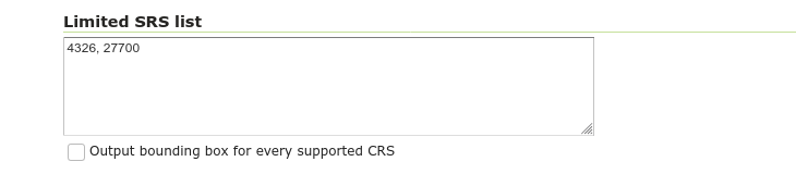 Some clients can have problems processing the large list of SRS (projections) that GeoServer can support when they are all listed in the capabilities document. It is possible to add a list of needed projections in the Limited SRS List box. This takes the form of a list of EPSG codes separated by commas, e.g. 4326,27700.