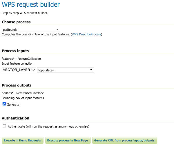The GeoServer WPS extension includes a request builder for testing out WPS processes through the Web administration interface. This tool can also be used to demonstrate processes, and construct your own examples.