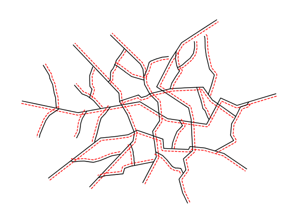 In this example, the first line symbolizer just paints the lines black. line 8 begins a second lines symbolizer, sets the color of the lines to be red (#FF0000) at line 10 and determines the composition of the line dashes at Line 11. Line 13 finally specifies a perpendicular offset of 5 pixels (positive, thus on the left side).