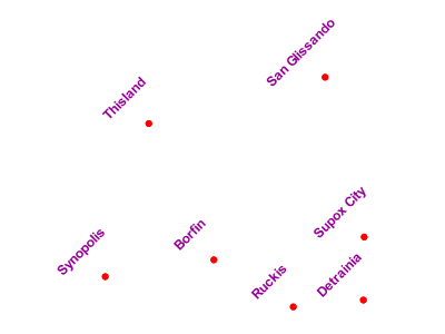 The symbolizer labels features with the text from the name property. The font is Arial in bold at 12 pt size, filled in purple. The labels are centered on the point along their lower edge, then displaced 25 pixels upwards, and finally rotated 45 degrees counterclockwise.