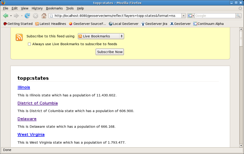 If you are using a web browser which can render RSS feeds simply visit the URL http://localhost:8080/geoserver/wms/reflect?layers=states&format=rss in your browser. This is assuming a local GeoServer instance is running with an out of the box configuration. You should see a result that looks more or less like this:
