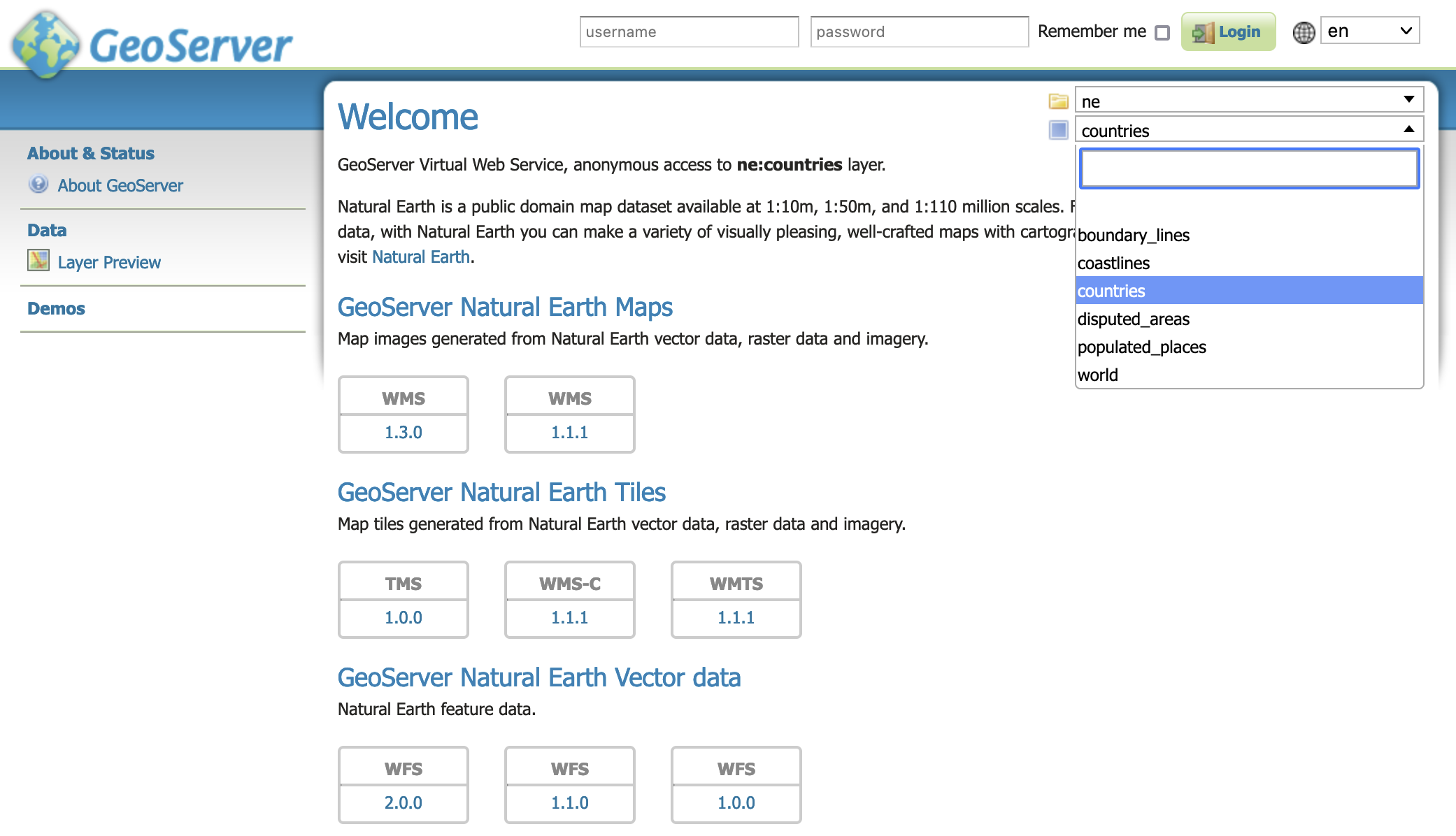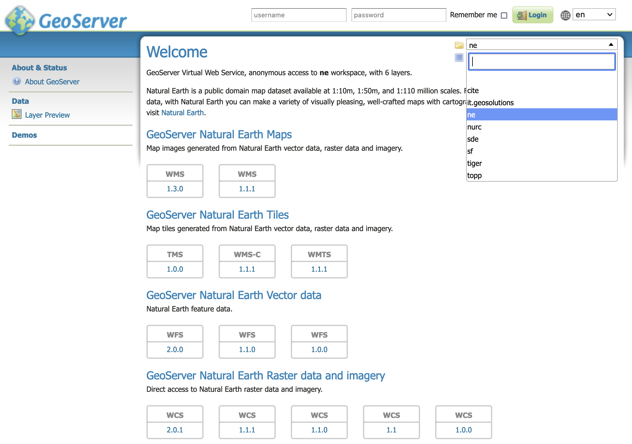 The welcome page lists the global web services (accessing the complete list of layers).